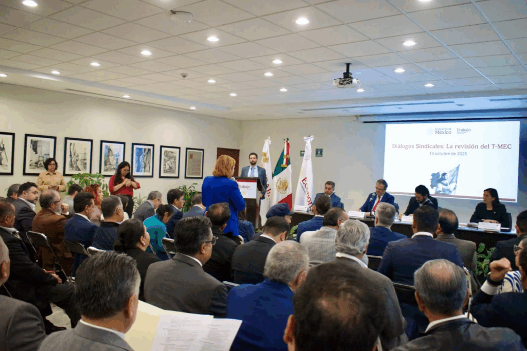 CIUDAD DE MÉXICO.- La Secretaría del Trabajo y Previsión Social llevó a cabo el encuentro “Diálogos Sindicales: La Revisión del T-MEC”, en el que participaron representantes del sector obrero, la Secretaría de Economía y la propia dependencia laboral.